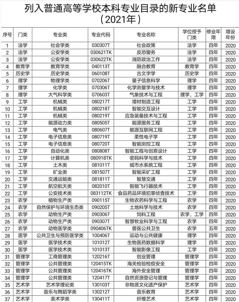 今天,记者从教育部获悉,教育部印发通知,根据高等学校专业设置与教学指导委员会评议结果,确定了同意设置的国家控制布点专业和尚未列入专业目录的新专业名单。据悉,新专业共37个,其中包括量子信息科学、智能交互设计、智慧交通等。 (中青报·中青网记者 叶雨婷)