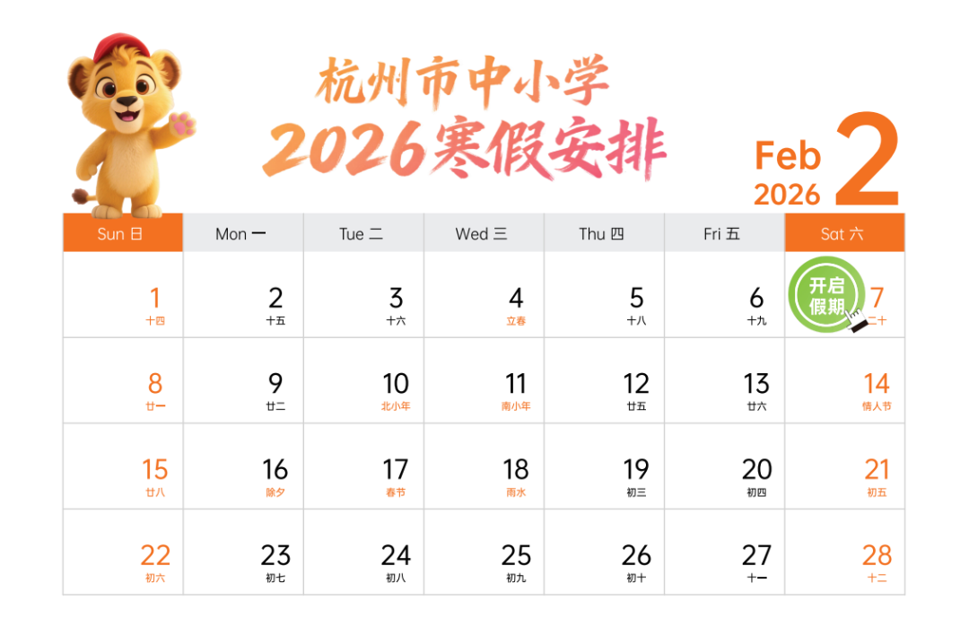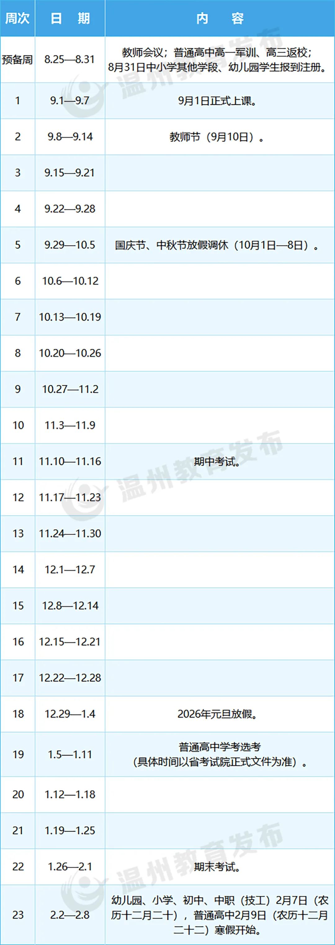 温州市:2025-2026学年第一学期,幼儿园、小学、初中、中职(技工)2月7日寒假开始;普通高中2月9日寒假开始。